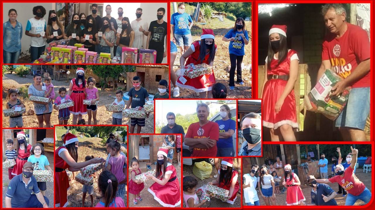 NO MÊS DE DEZEMBRO DE 2020 FOI REALIZADO O NATAL SOLIDÁRIO, ONDE VÁRIAS FAMÍLIAS FORAM CARINHOSAMENTE CONTEMPLADAS COM CESTAS BÁSICAS. AS CRIANÇAS FIZERAM A FESTA COM BRINQUEDOS E DOCES. A AÇÃO FOI MUITO GRATIFICANTE PELO FATO DE PRESENCIR A ALEGRIA ESTAMPADA NO ROSTINHO DE CADA UM. MESMO SENDO UMA "GOTINHA NO OCEANO" É IMPORTANTE FAZER A DIFERENÇA NA VIDA DAS PESSOAS... MESMO SENDO TÃO POUCO POIS, A SATISFAÇÃO EM SEREM VISITADOS, LEMBRADOS COM CARINHO, ATENÇÃO E RECEBIDO UM "FELIZNATAL," FOI INDESCRITÍVEL A EMOÇÃO, TANTO PARA A COMUNIDADE QUANTO PARA NÓS, ROTARIANOS.