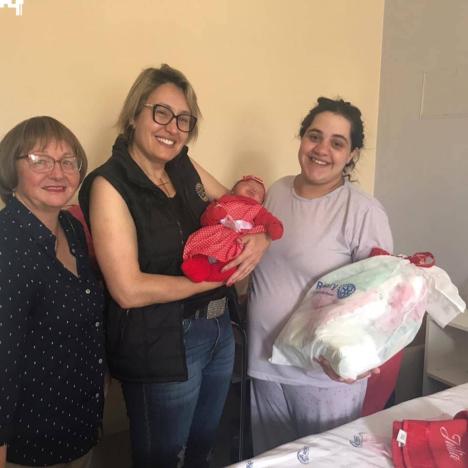 Entrega de kits de enxoval para bebês nascidos na ala do sus do HNSO. Com Marli Madruga kowaleski presidente ano Rotário 2019-20 e Joceli Almeida madrinha do projeto Cegonha.