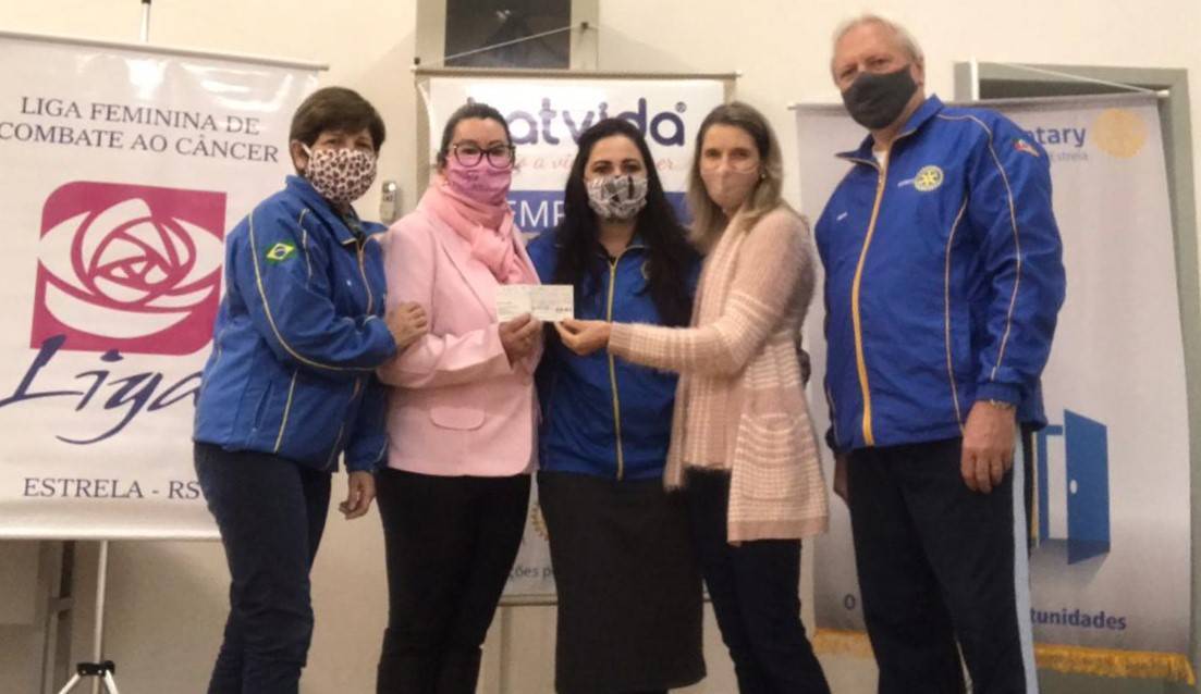 O Rotary Club de Estrela realizou a doação de um cheque de R$ 7.200,00 à Liga Feminina de Combate ao Câncer. O valor foi arrecadado durante o evento Queijos e Vinhos, promovido anualmente em parceria com o Imec Supermercados. Devido às restrições da pandemia a eventos presenciais, especialmente neste ano, o Queijos e Vinhos foi adaptado e as pessoas degustaram os produtos em suas casas.