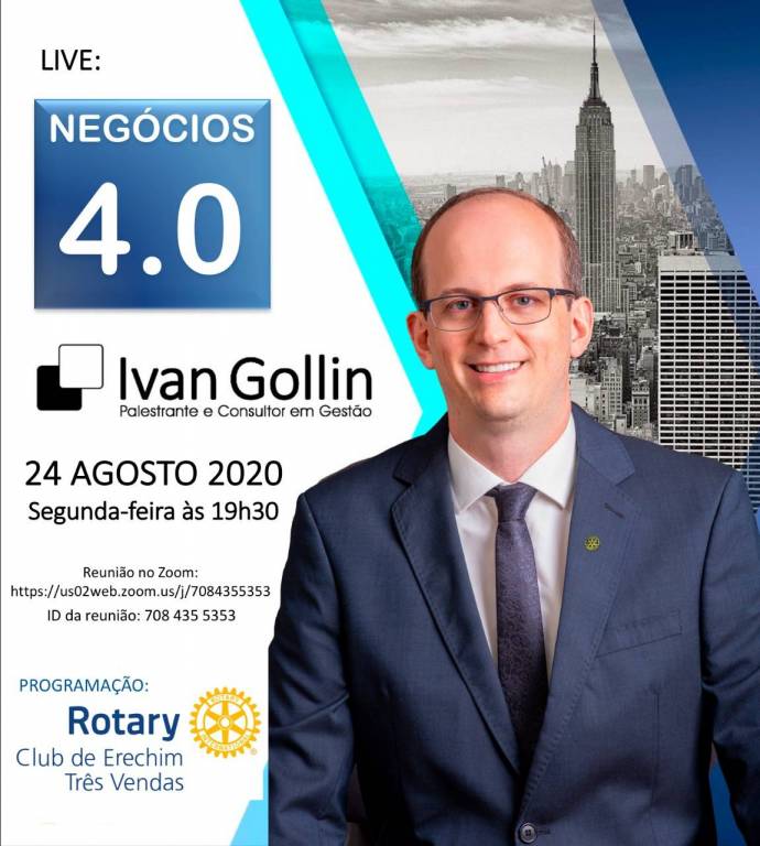 O Rotary Club de Erechim Três Vendas promoveu, no dia 24/08/2020, às 19h30min, uma palestra virtual com o tema "Negócios 4.0". A live foi ministrada por Ivan Gollin, Palestrante e Consultor em Gestão, com MBA/FGV em Gestão Empresarial e Pós-Graduado em Administração.
